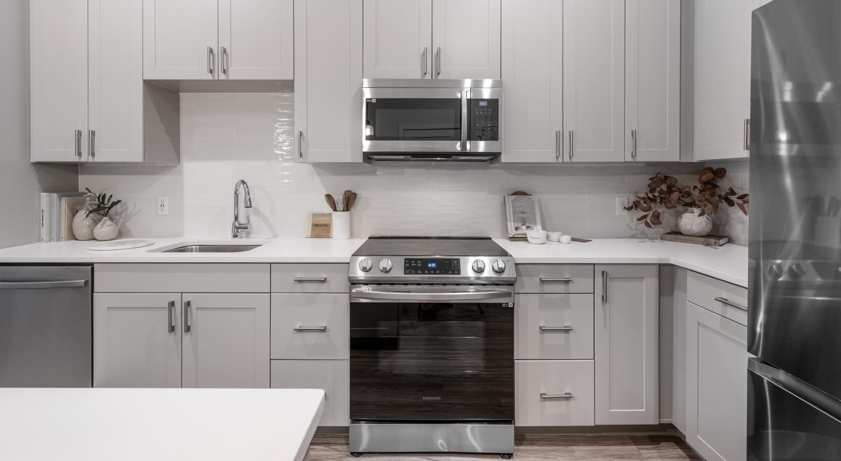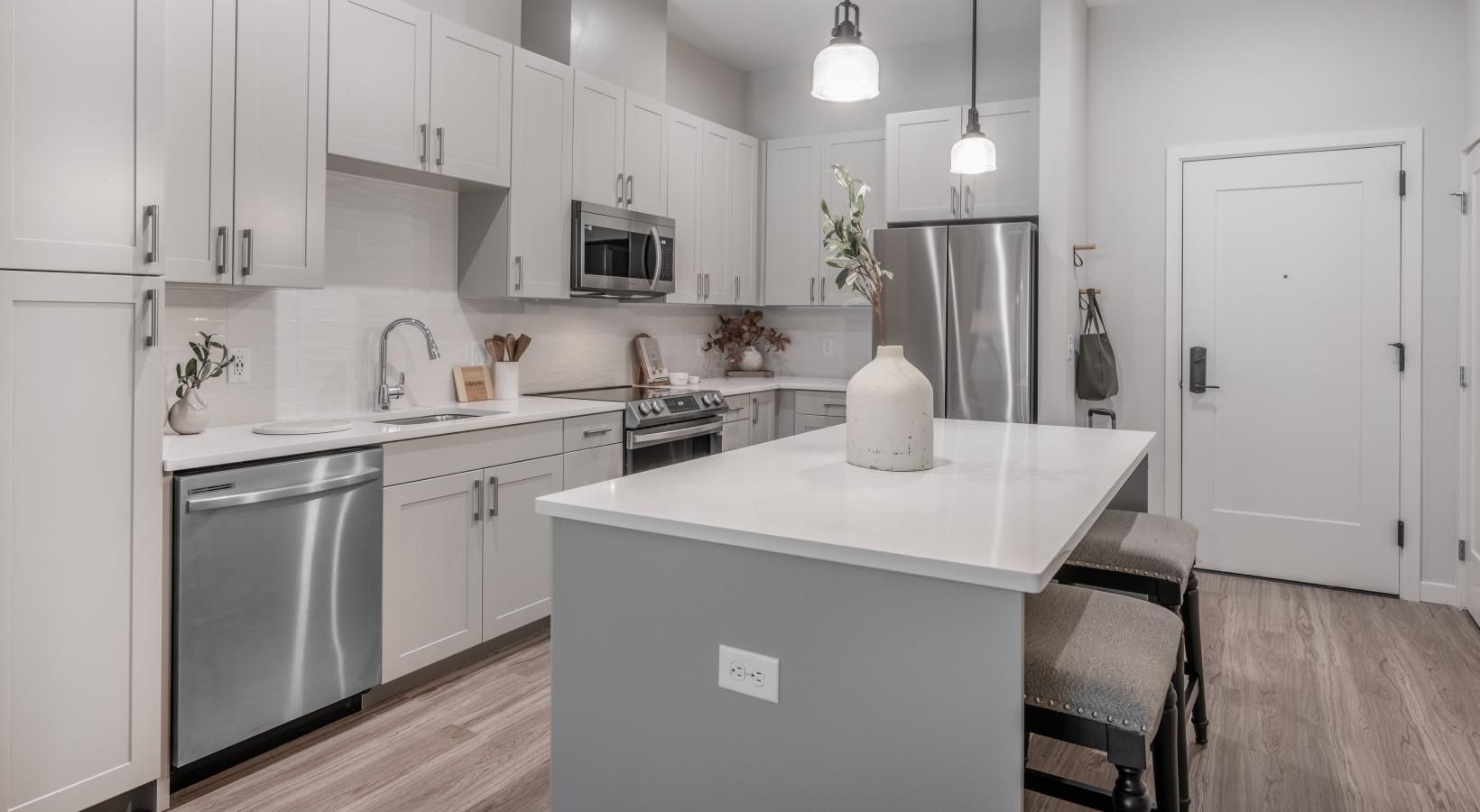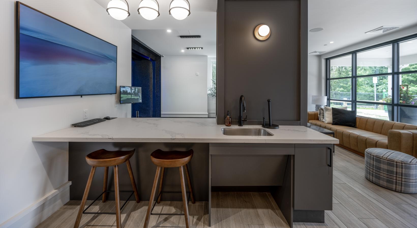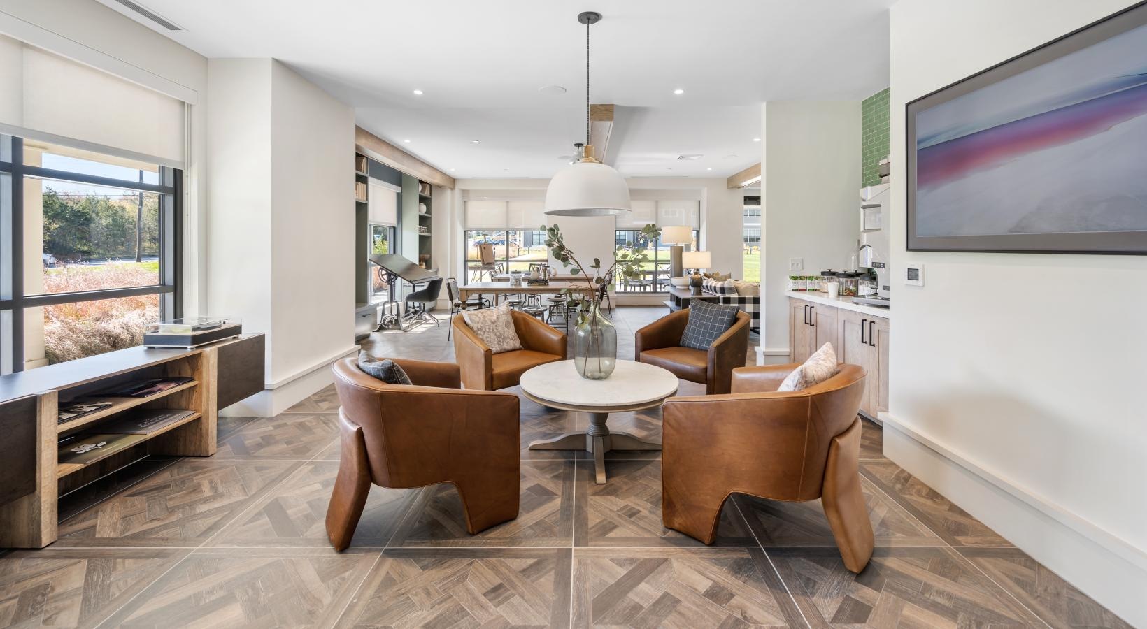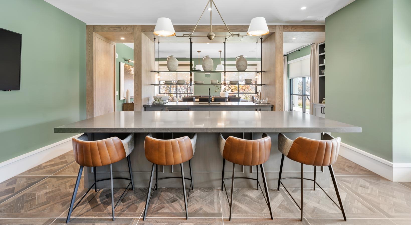 • Oxbow Wayland's community clubhouse kitchen with chairs at large island