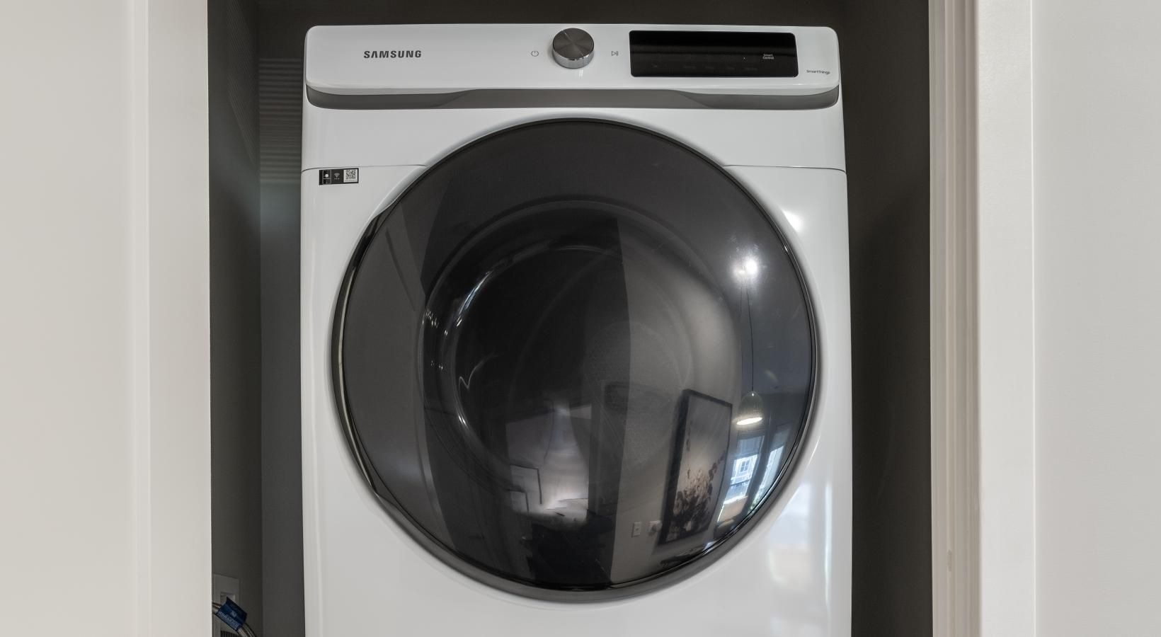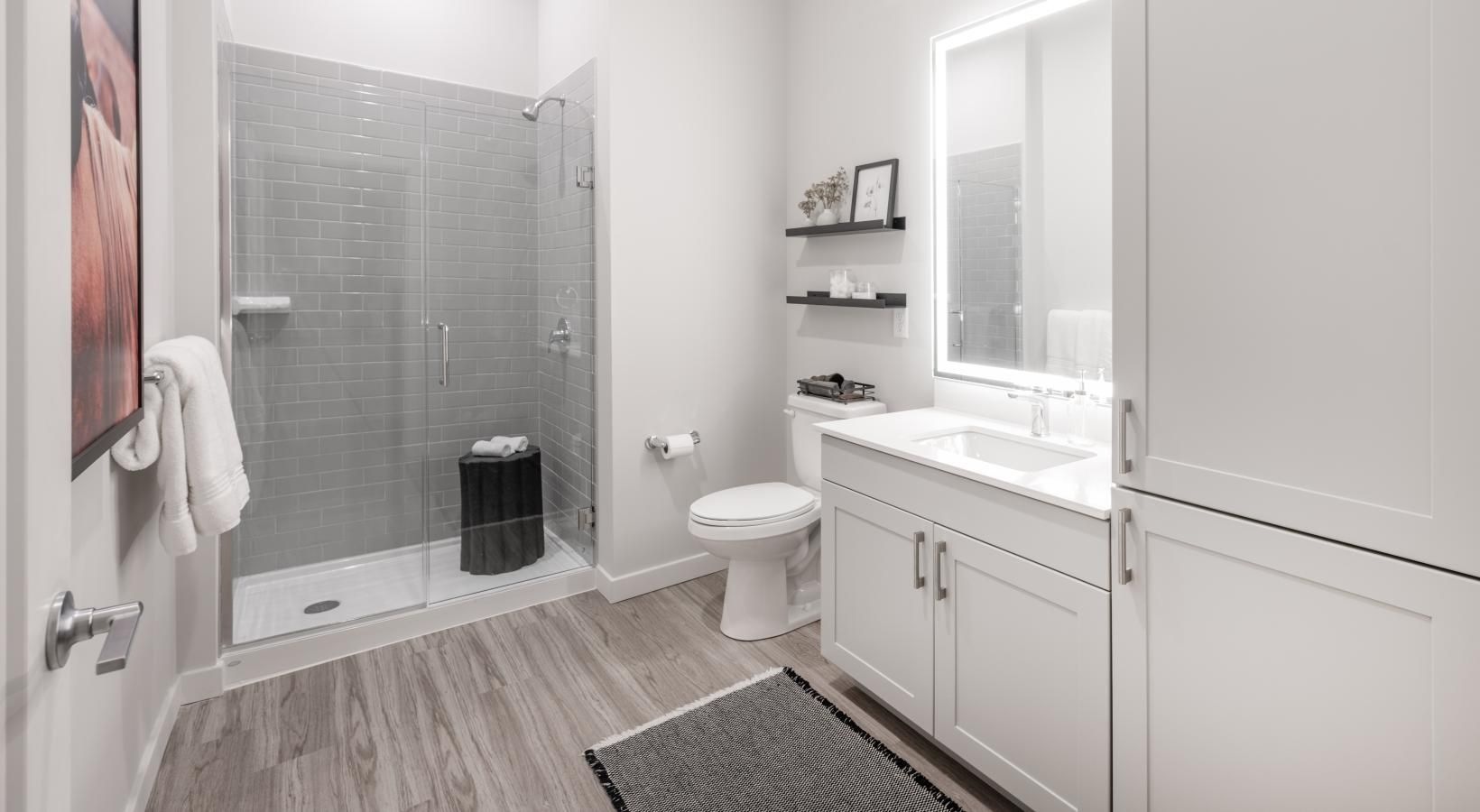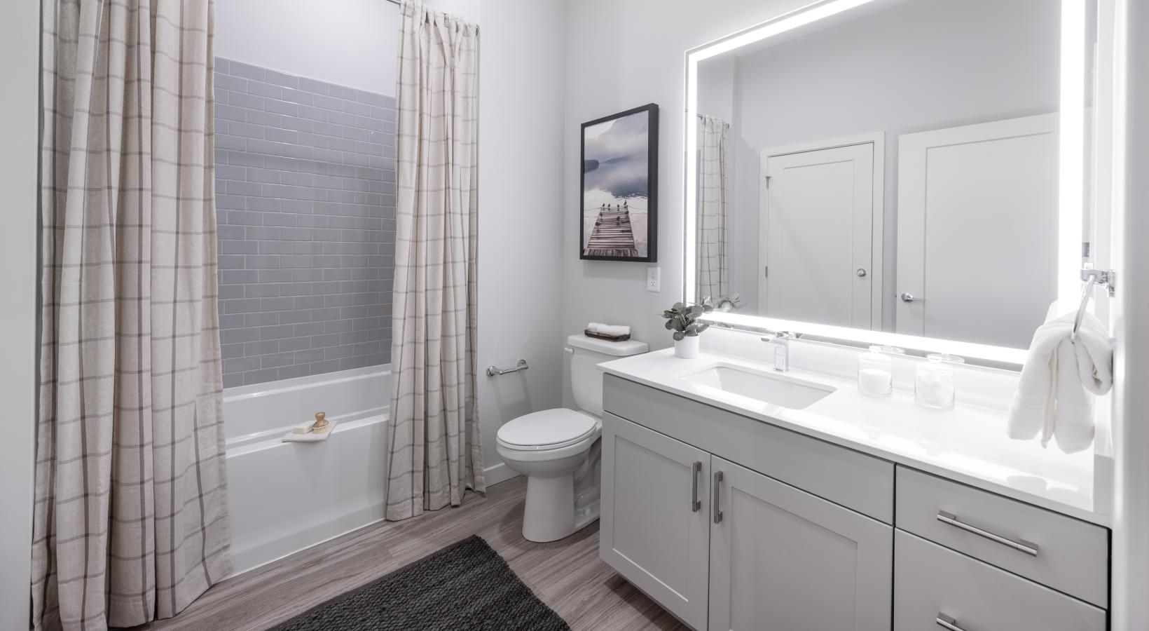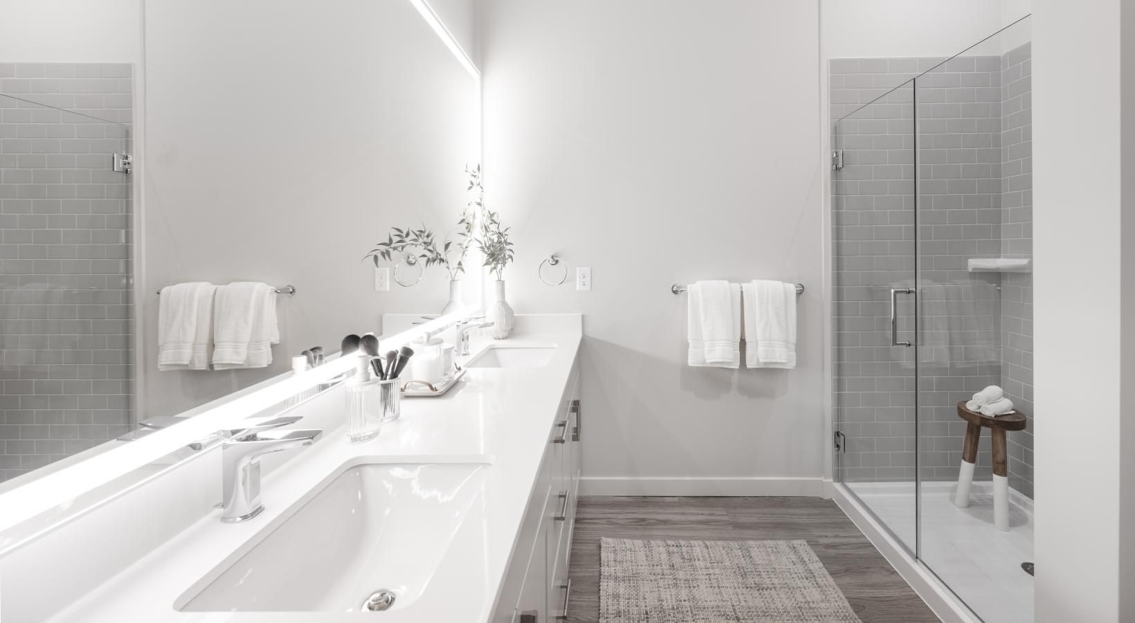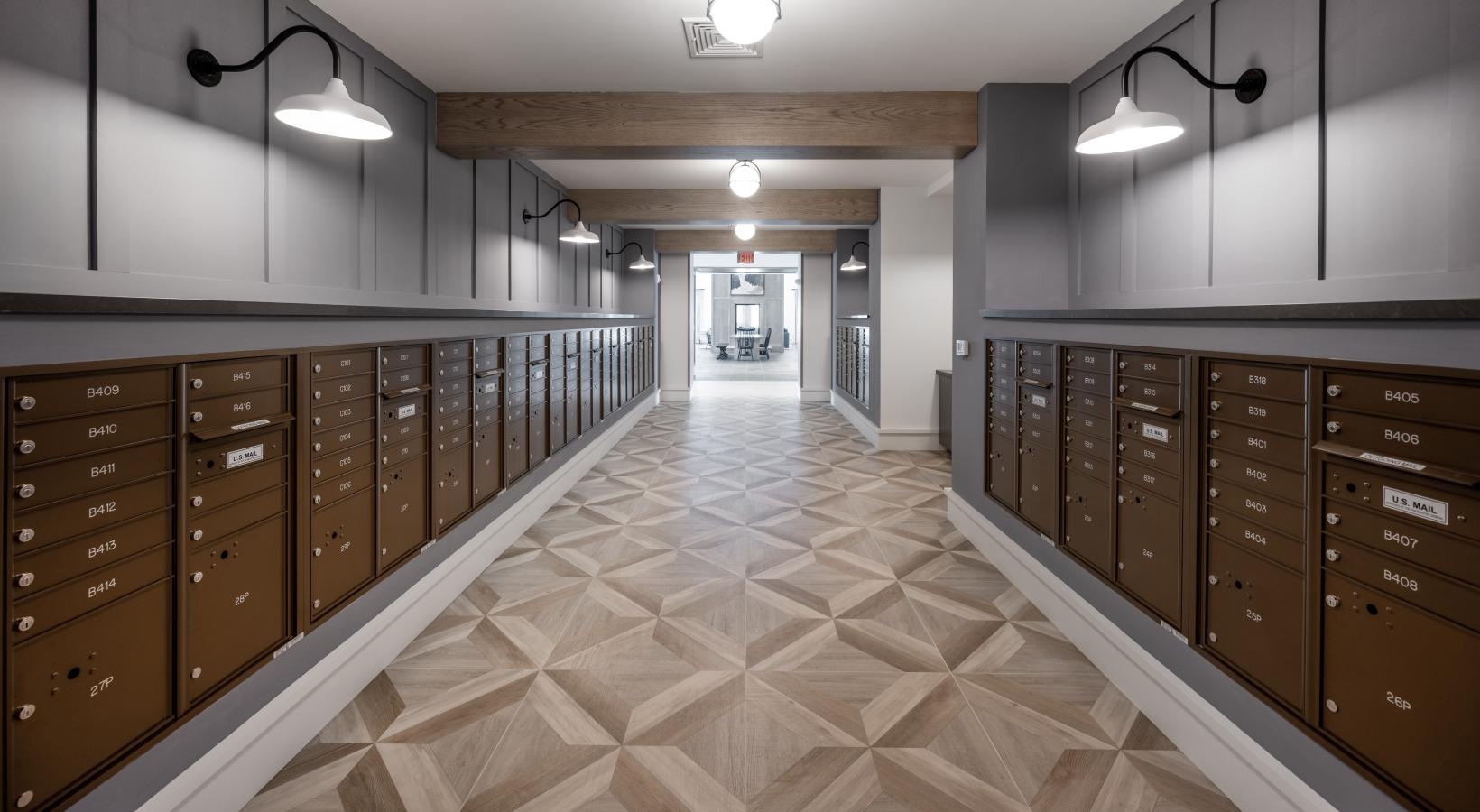 • Oxbow Wayland's community clubhouse kitchen with chairs at large island