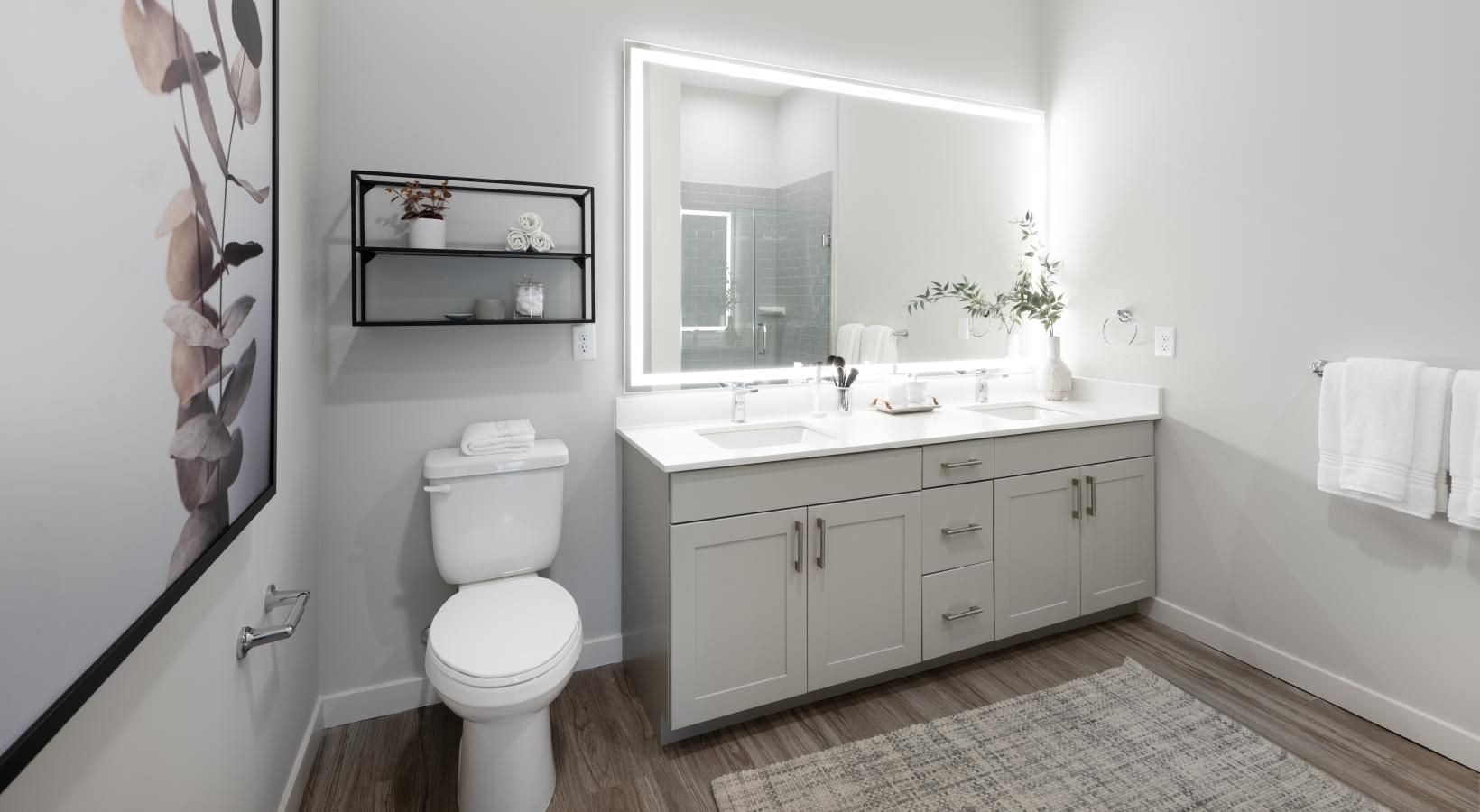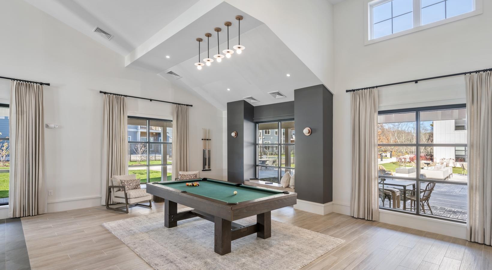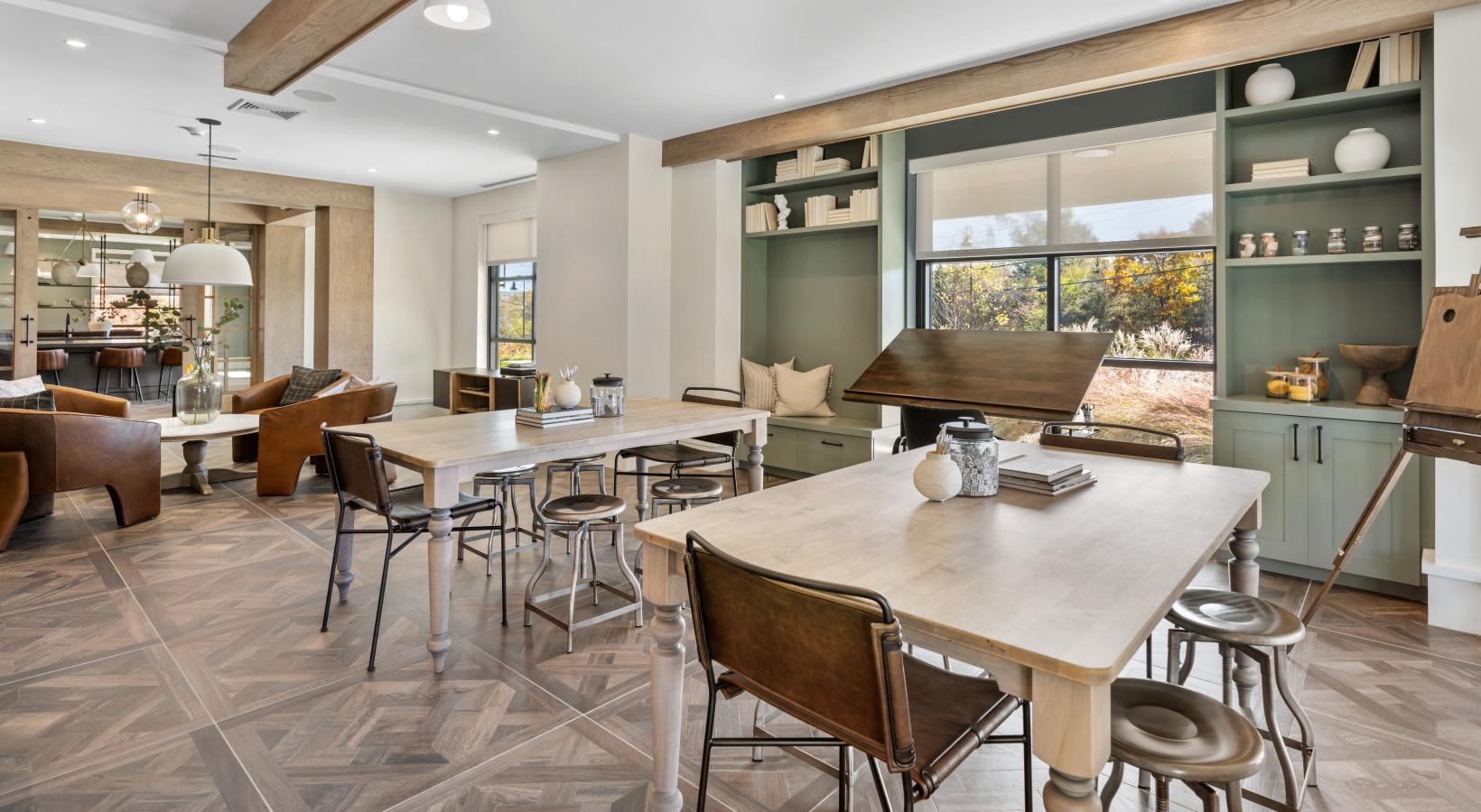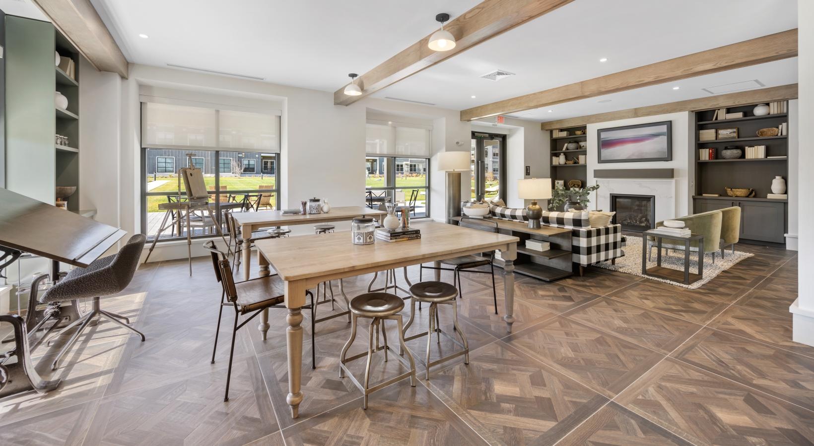 • Worktables with stools in the bright community clubhouse perfect for residents at Oxbow Wayland who work from home