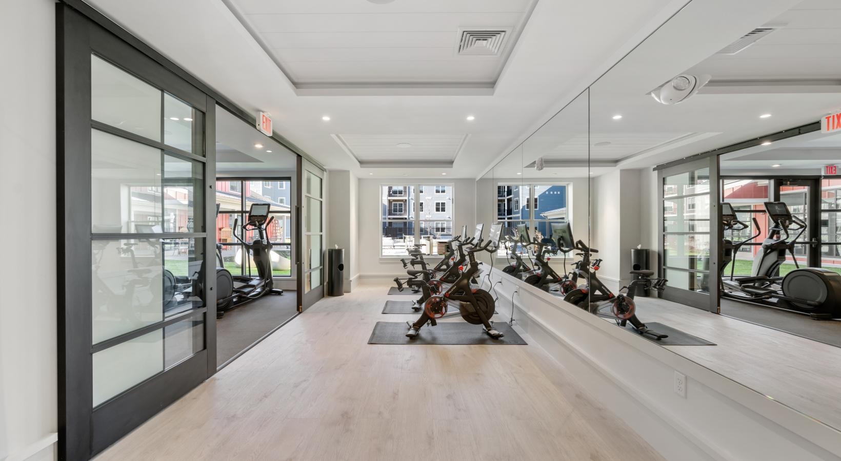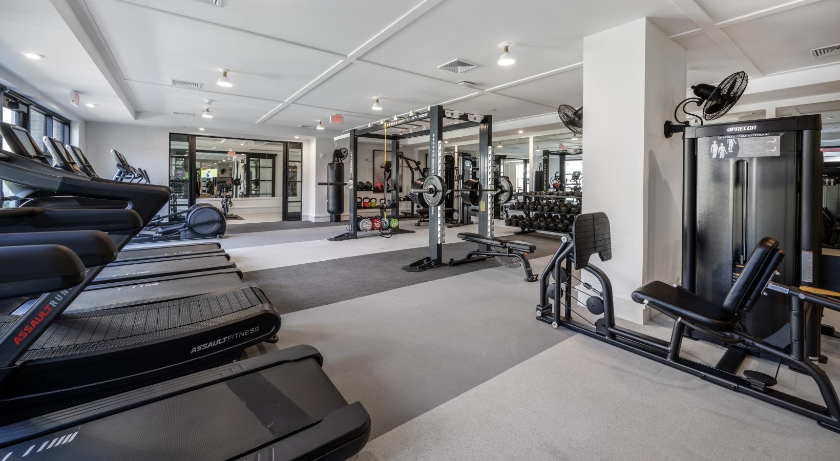 • Oxbow Wayland's sunlit gym with weights and large windows
