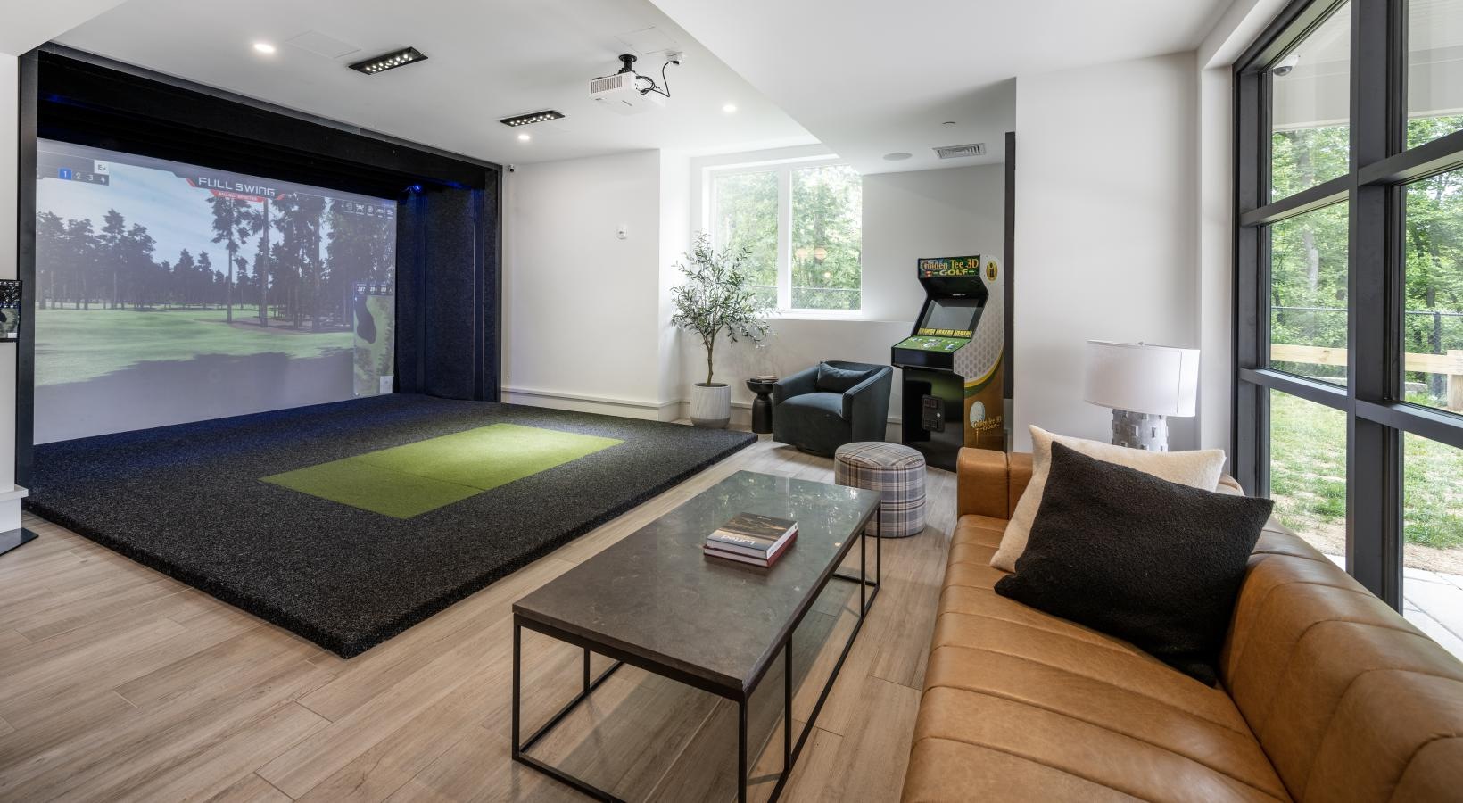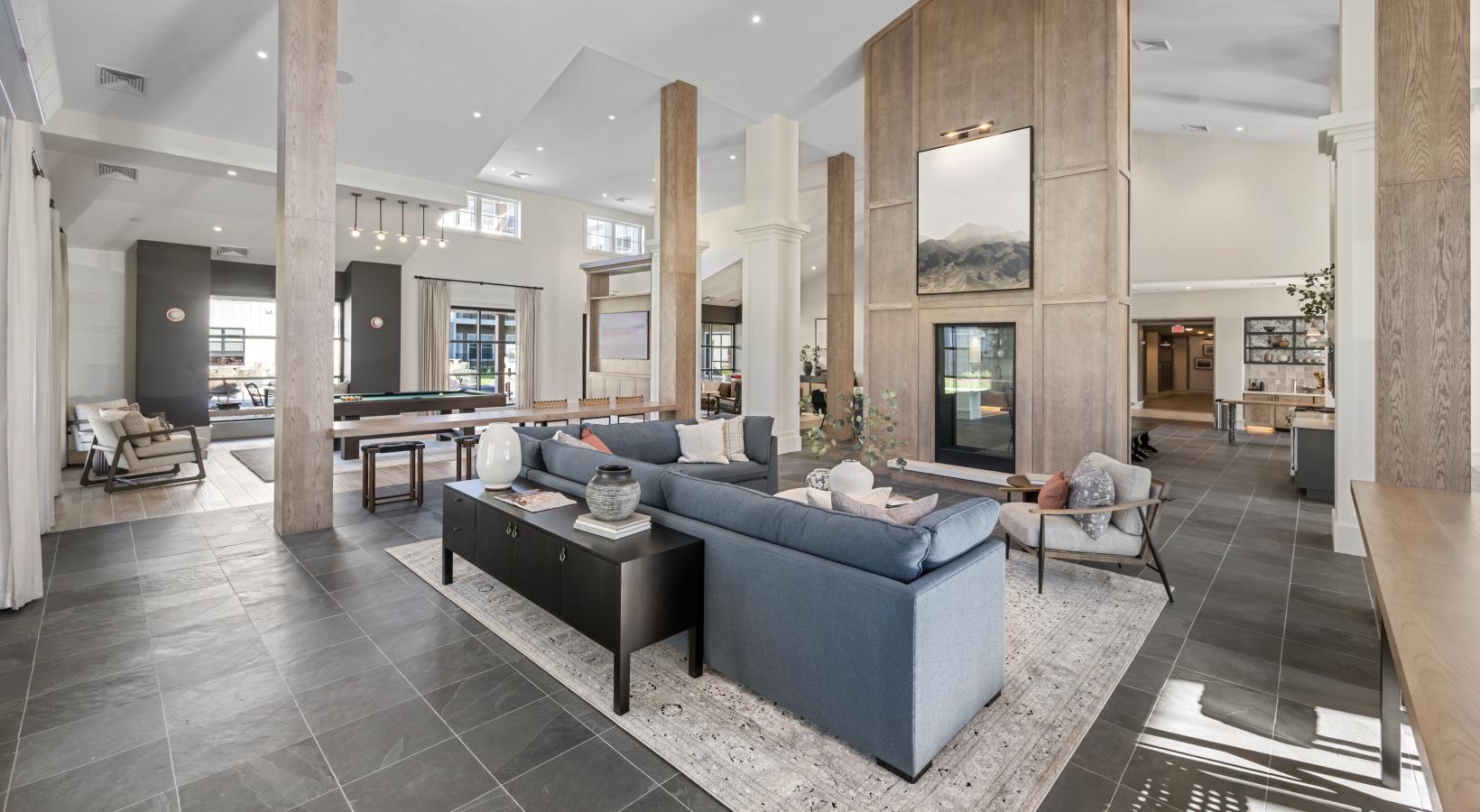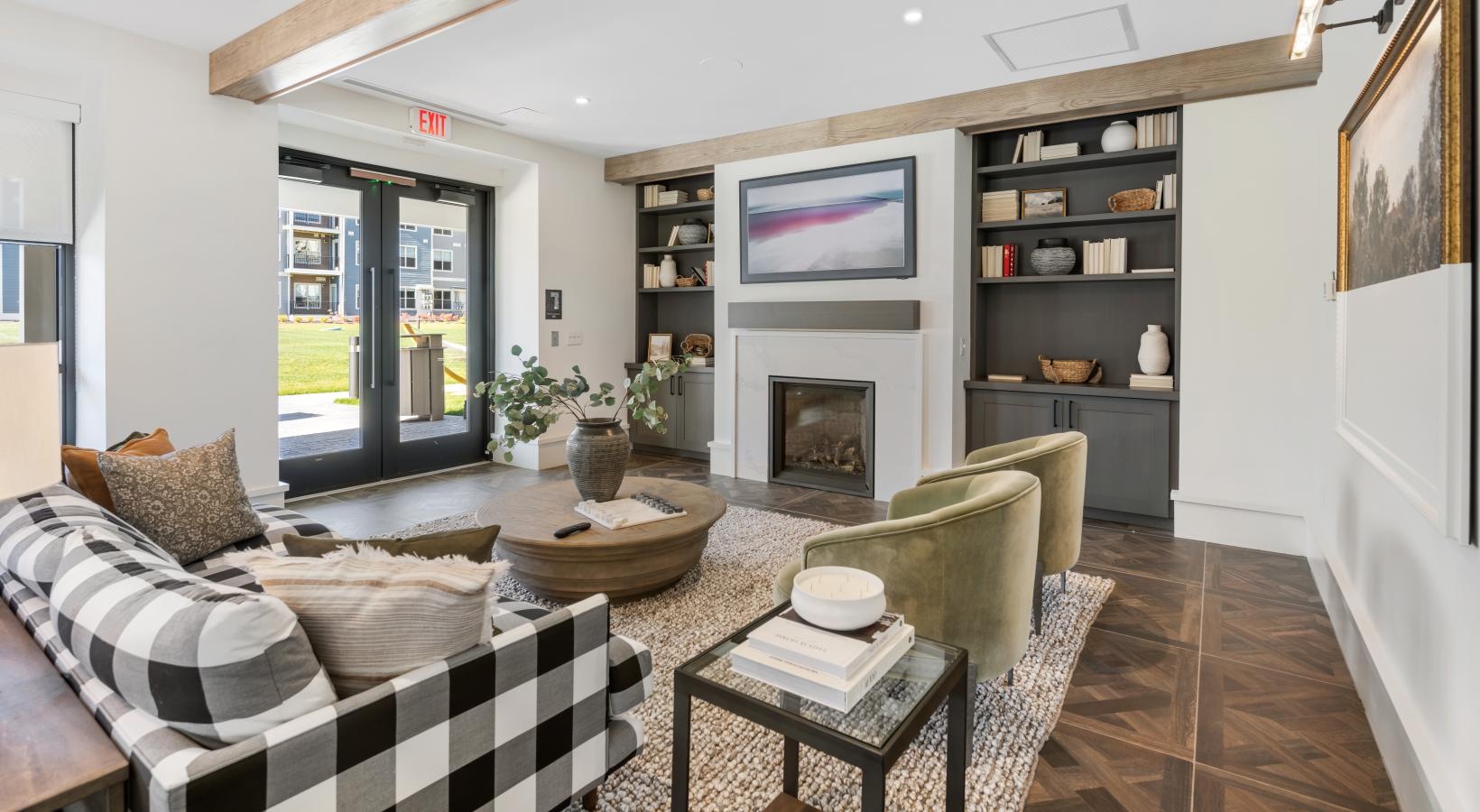 • Spacious community clubhouse with bookshelves and fireplace at The Rockwell