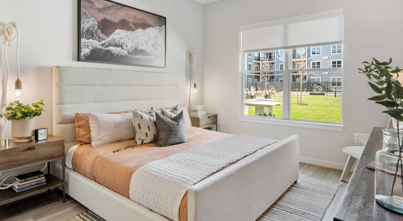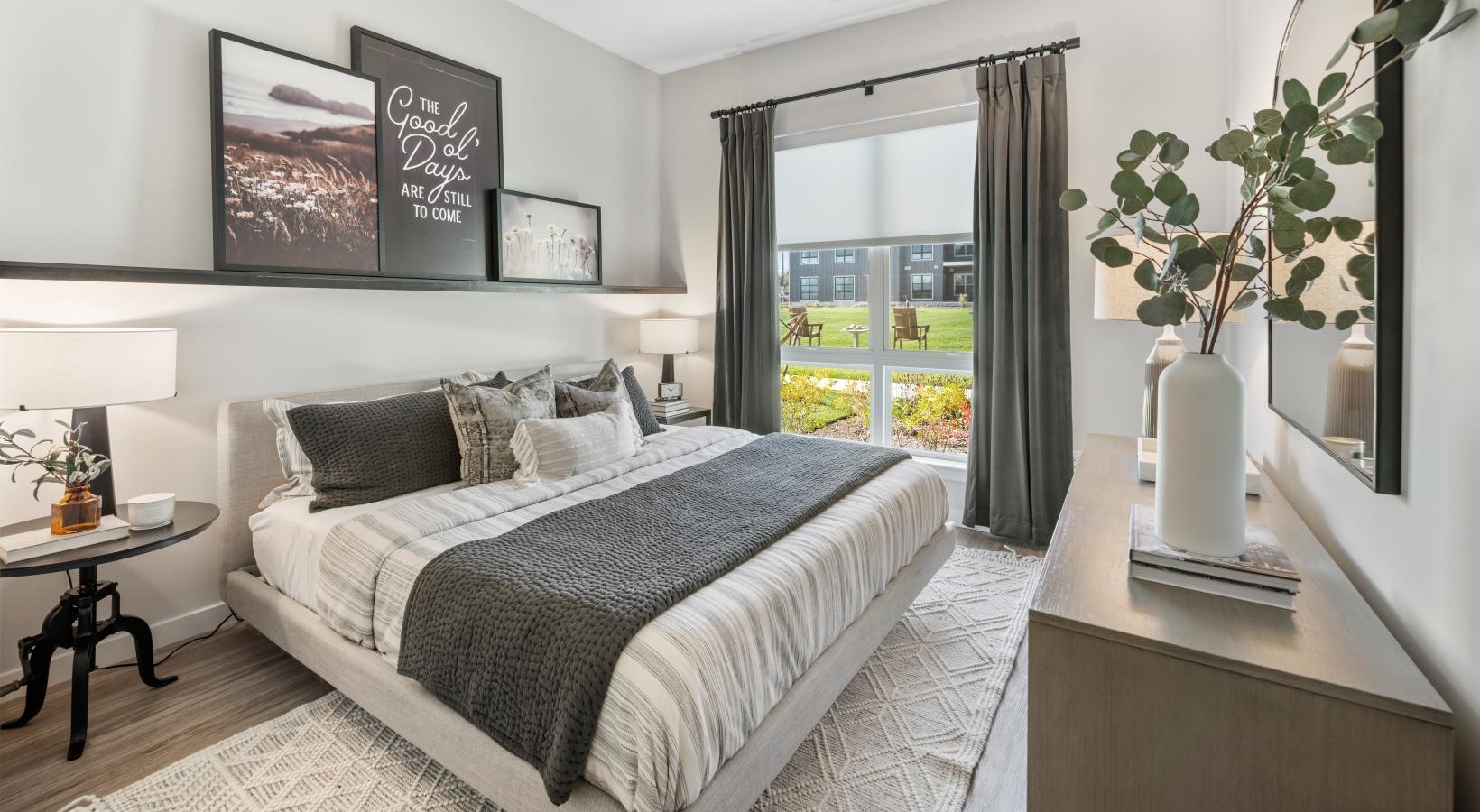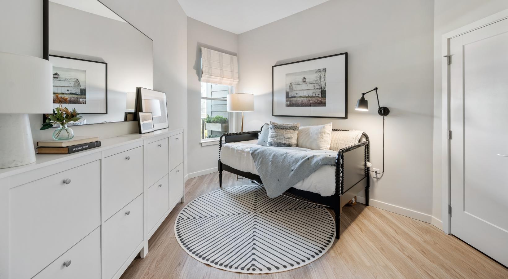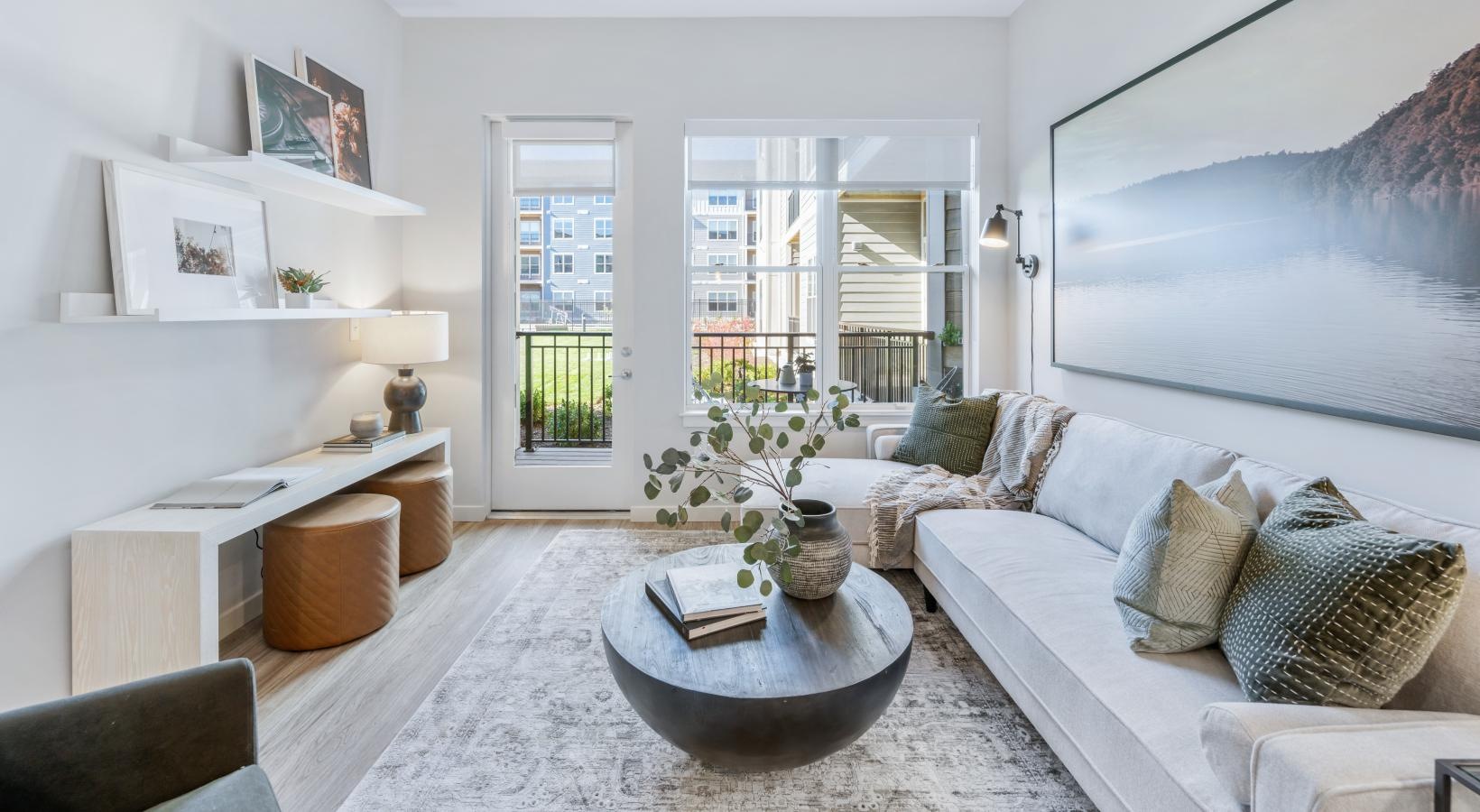 • Spacious community clubhouse with bookshelves and fireplace at The Rockwell