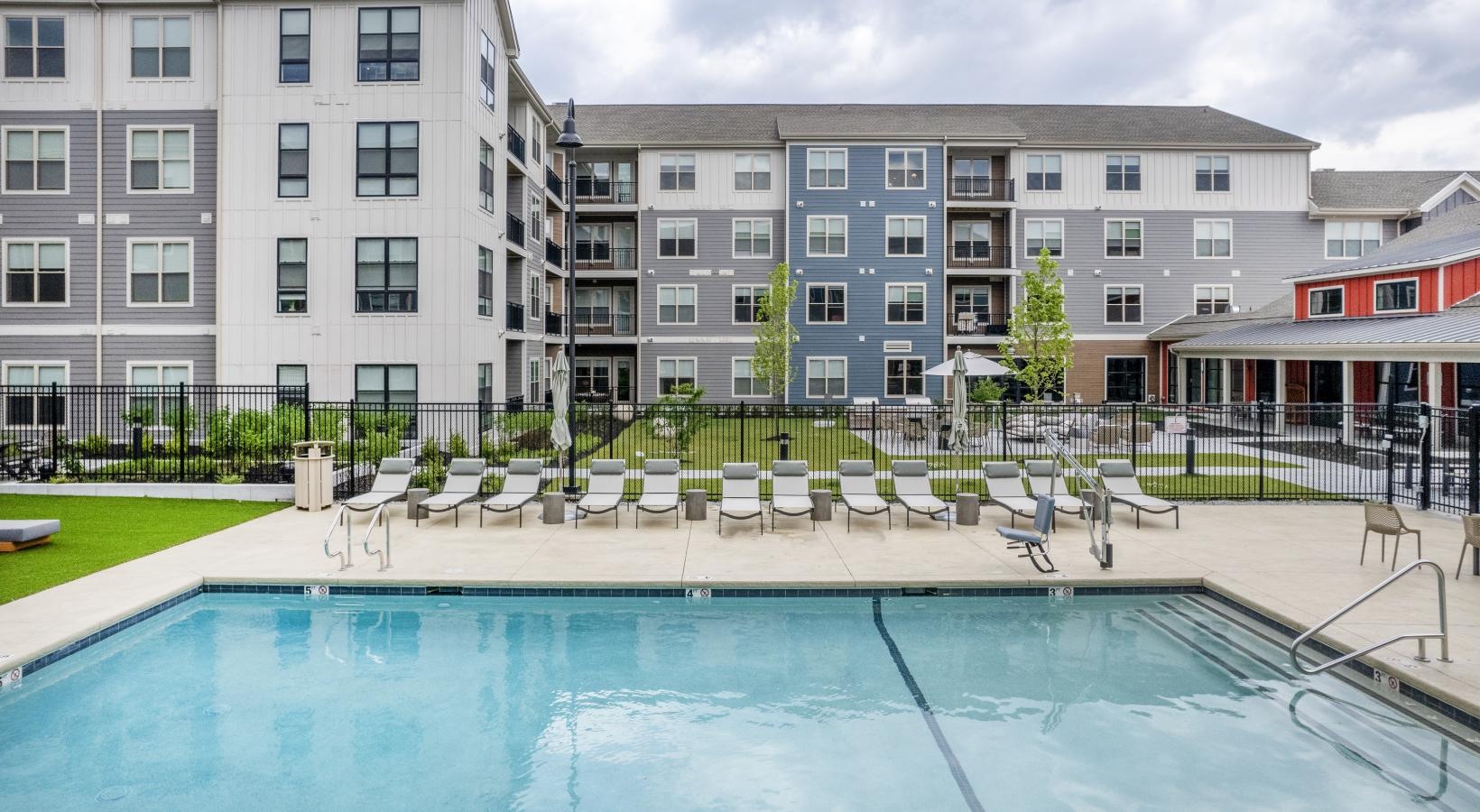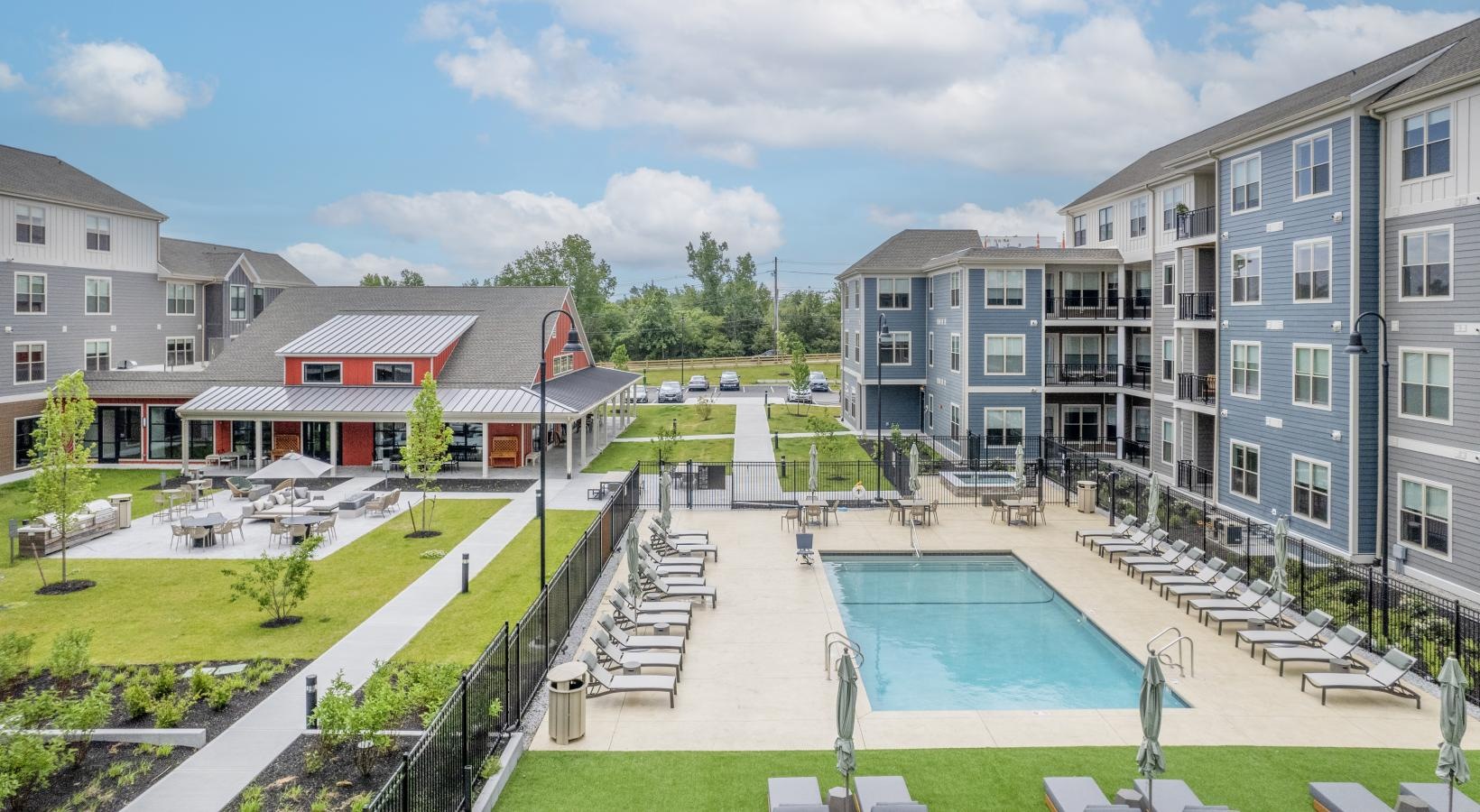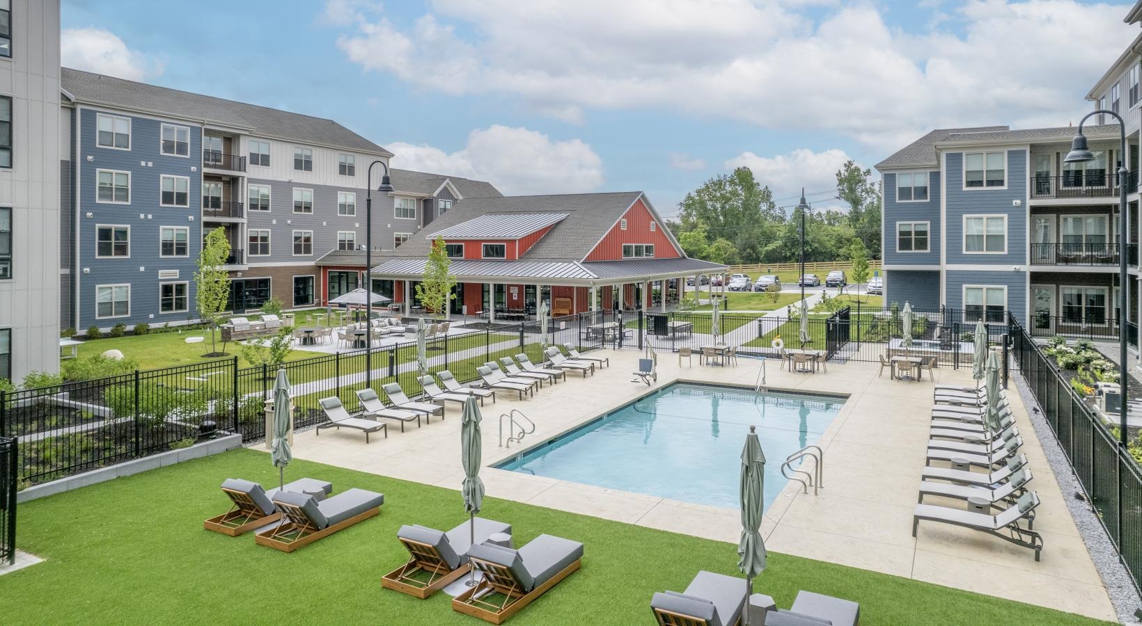 • Aerial view of gated pool area in Oxbow Wayland's apartment community