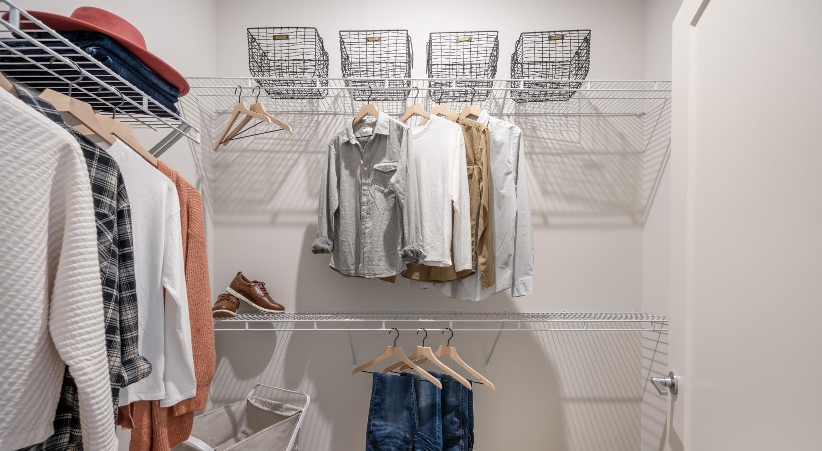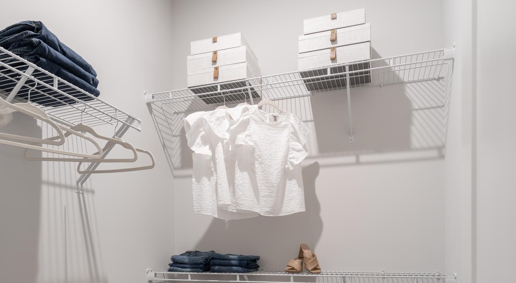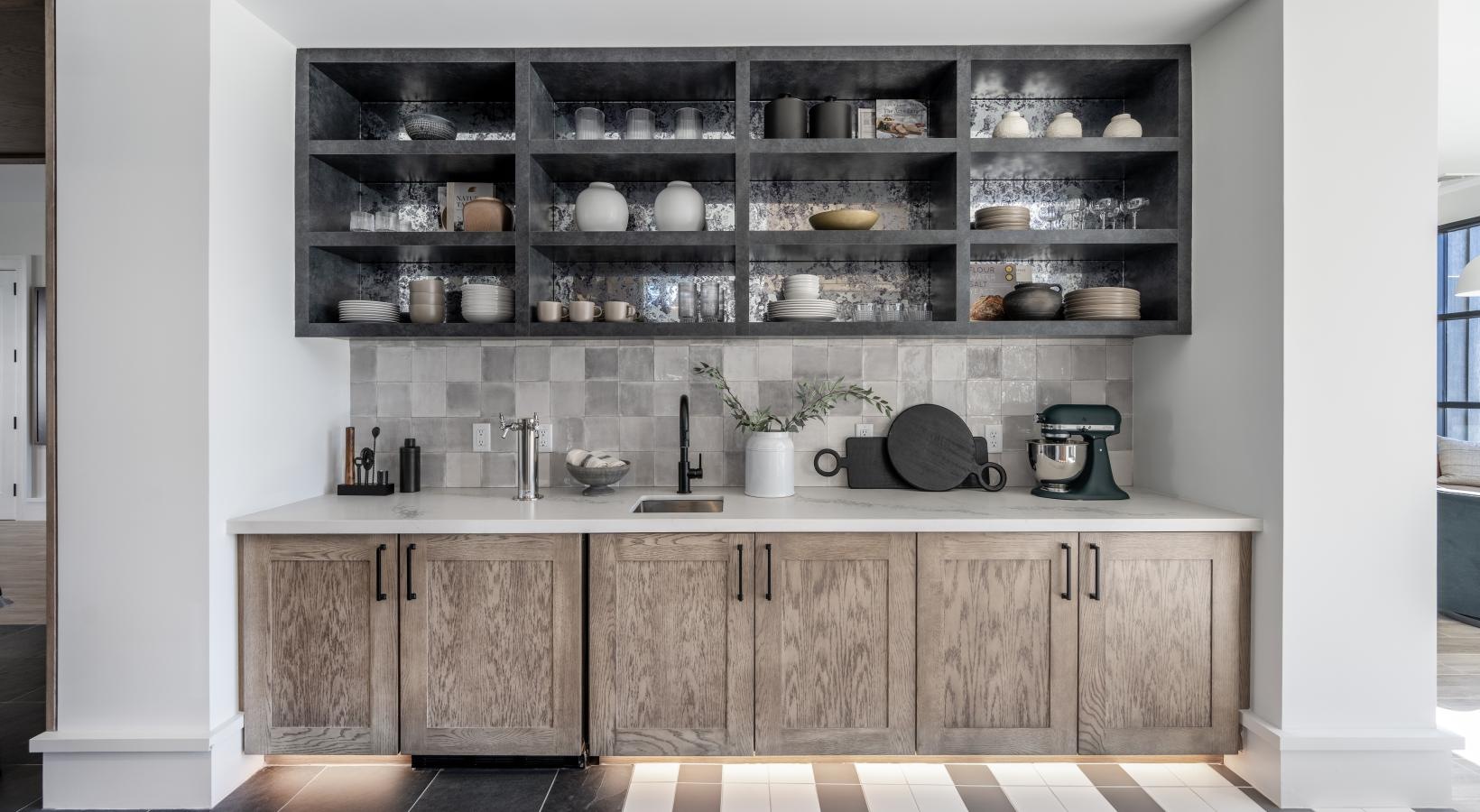 • Kitchen counter with sink and overhead shelving in Oxbow Wayland's clubhouse