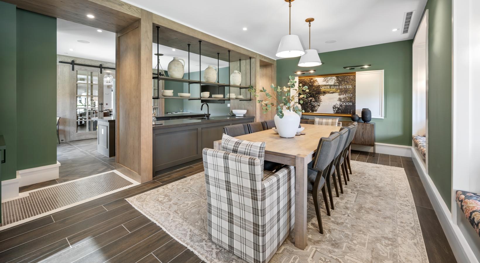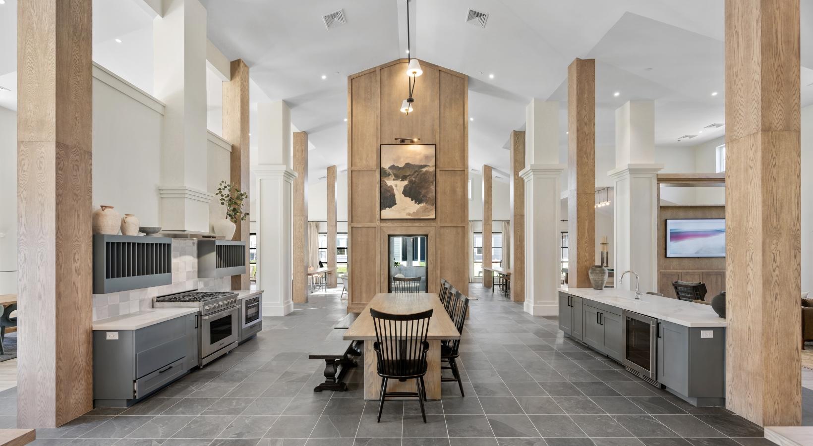 • Oxbow Wayland's community resident dining room with a large table and counter prep area