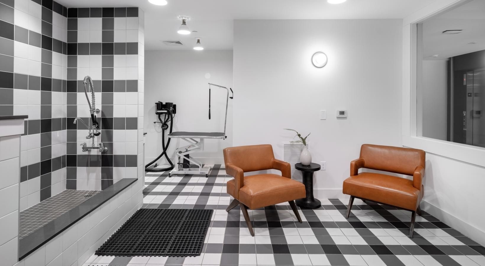• Two leather chairs inside the pet salon area at Oxbow Wayland
